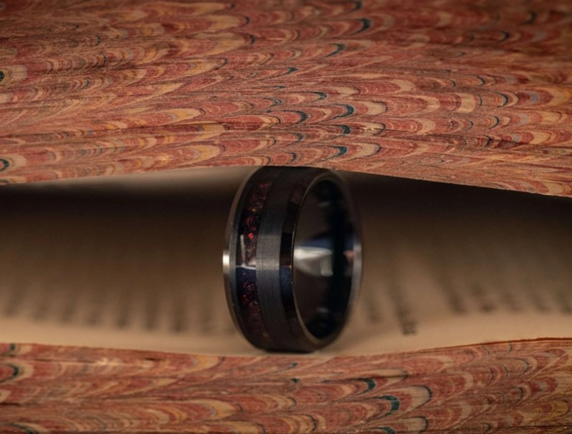 This piece is for the person who walks their own path. The black tungsten band has a sleek, brushed texture that feels strong and grounded. Set into the center is a fire opal inlay that flickers with red, orange, and deep green under the light. It’s bold, masculine, and unafraid to stand out. Perfect for those who want a ring that doesn’t follow the rules but still holds deep meaning.